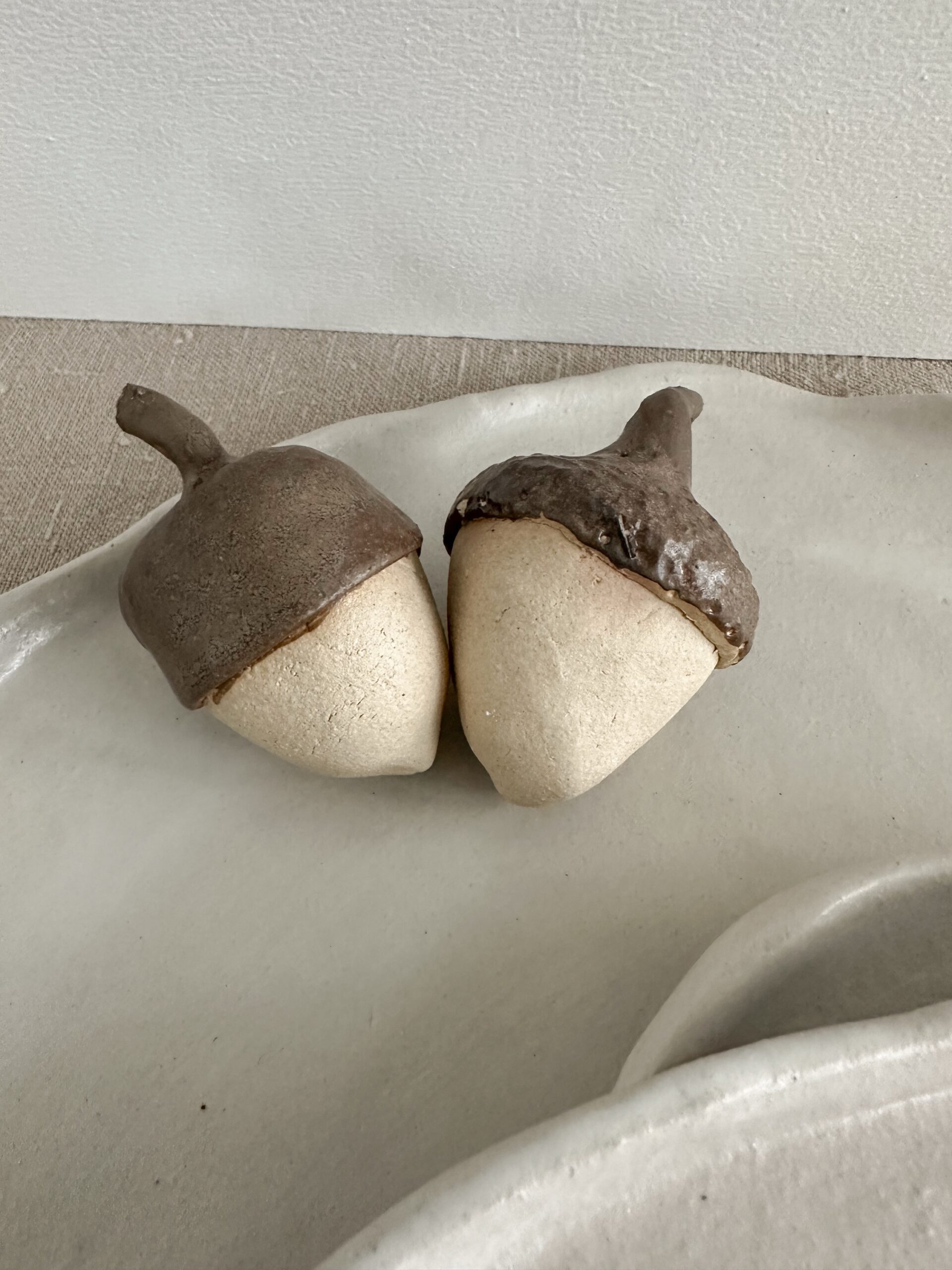 Elk eikeltje wordt met aandacht met de hand gevormd en op hoge temperatuur gebakken. Tijdens het stoken ontwikkelt het glazuur zijn eigen karakter: soms dieper van kleur, soms met een subtiele tekening. Geen twee eikeltjes worden ooit hetzelfde — precies dat maakt elk stuk een klein kunstobject.